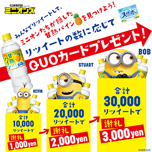 応募方法:Twitterにてサントリー天然水アカウントをフォローし、ハッシュタグ「#甘熟パインをミニオンズが隠しちゃった」の投稿をリツイート