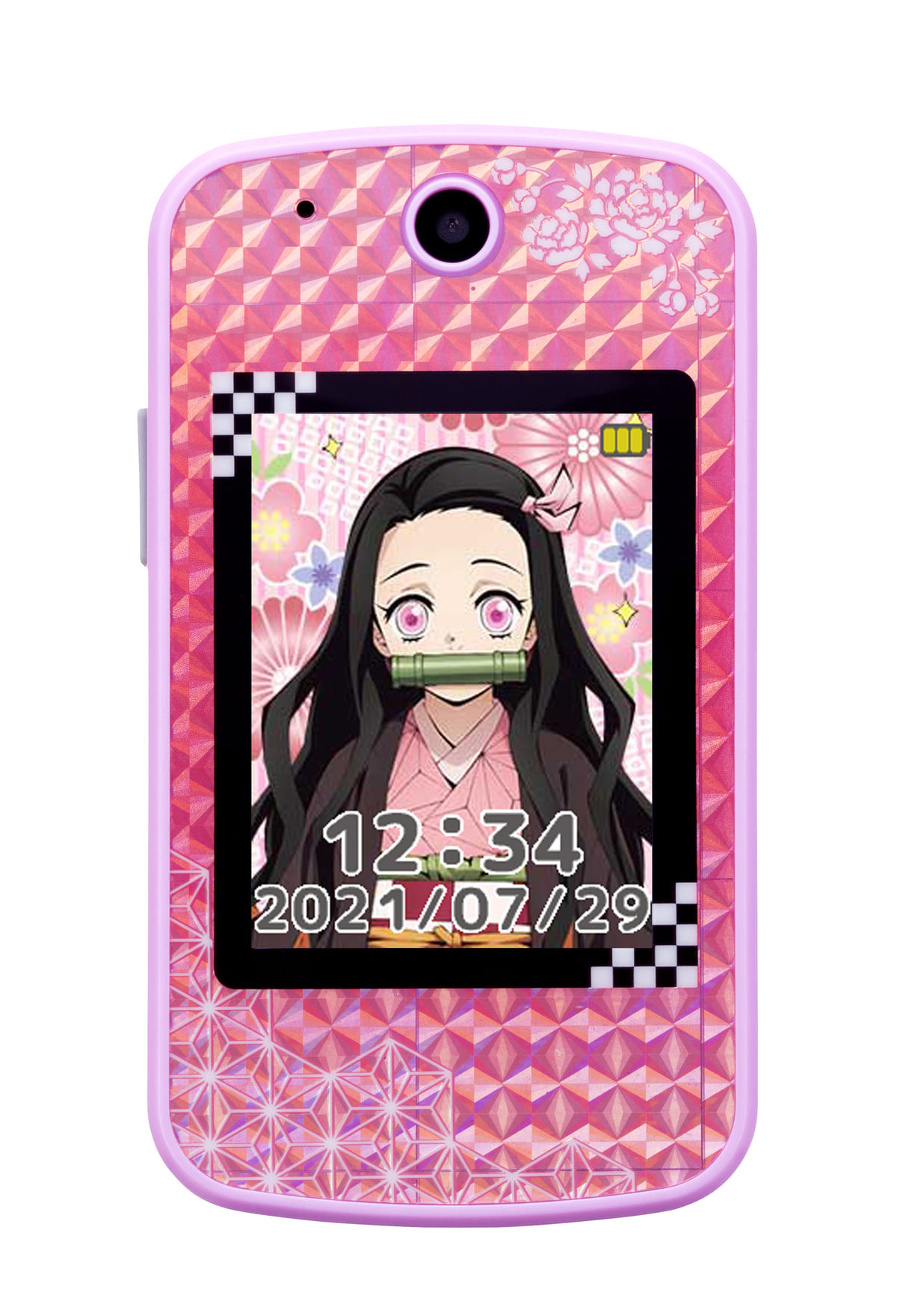 ピンクラメのきらきらした本体には、「竈門襧豆子」の着物をイメージした麻の葉模様や牡丹の花のイラストをホワイトで配置。