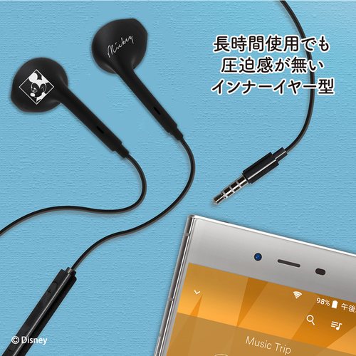 ブラックを基色としたイヤホンで、イヤホン部の左右にそれぞれ「ミッキーマウス」のイラストとネームがデザインされています。