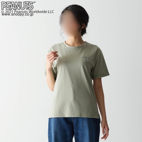 ソフトカーキの「スヌーピー」ドロップショルダーのオーバーTシャツ。