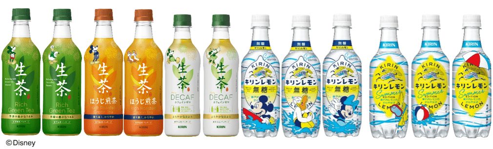「生茶」ブランドと「キリンレモン 無糖」で全9種類の「ディズニーデザインボトル」が、夏をイメージしたオリジナルパッケージで発売されます。