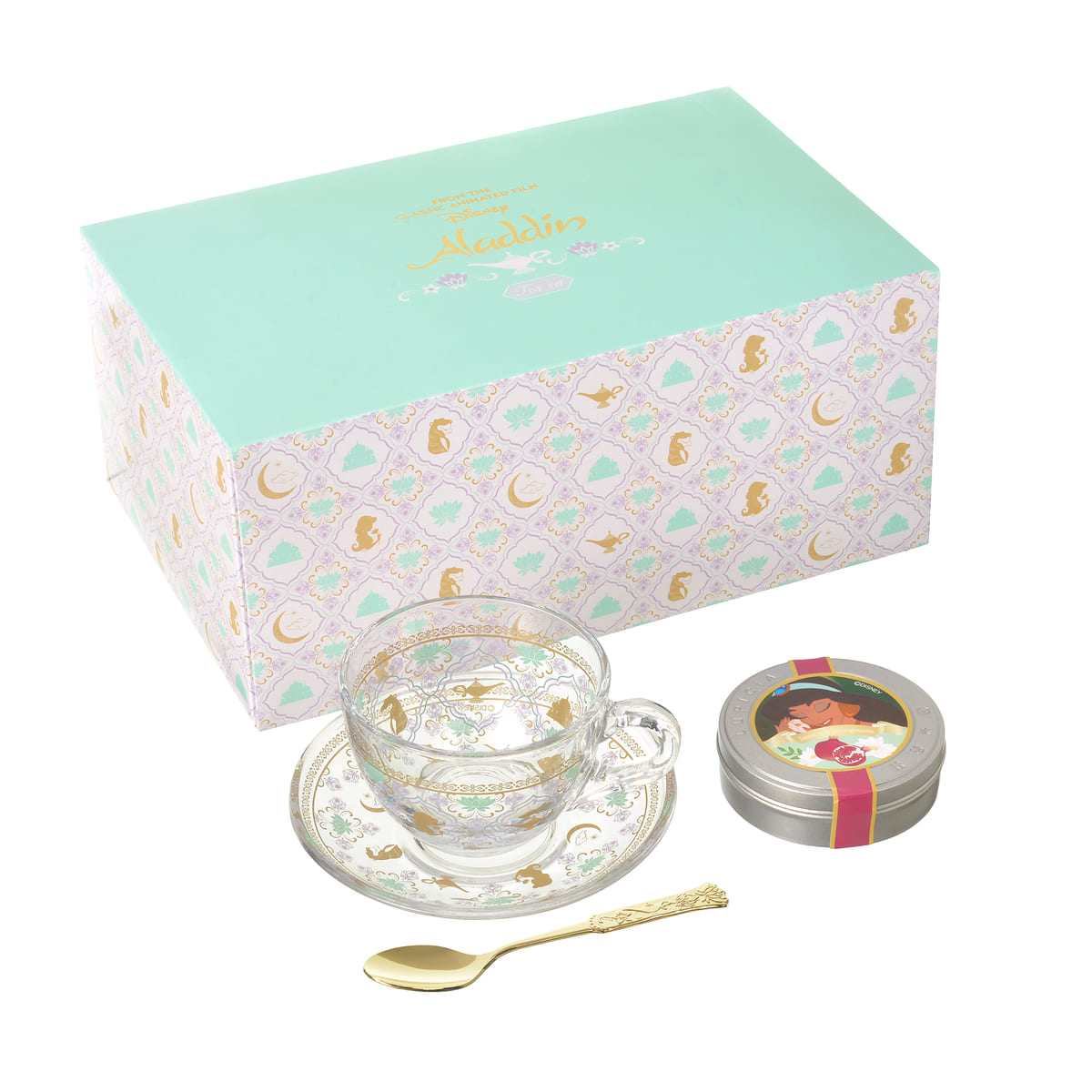 『アラジン』のディズニープリンセス「ジャスミン」をイメージしたフレーバードティーと、カップ&ソーサー、スプーンのボックスセット。