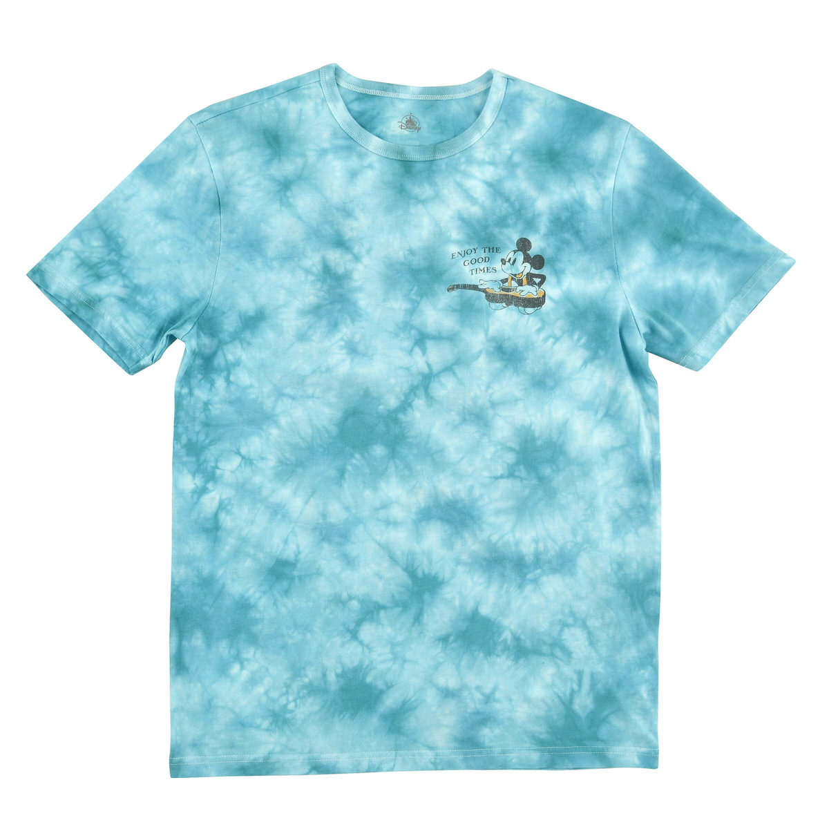 ブルーのタイダイ染めのTシャツフロント面に「ミッキーマウス」のワンポイントがプリントされた半袖Tシャツ。