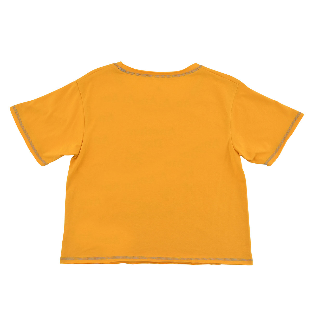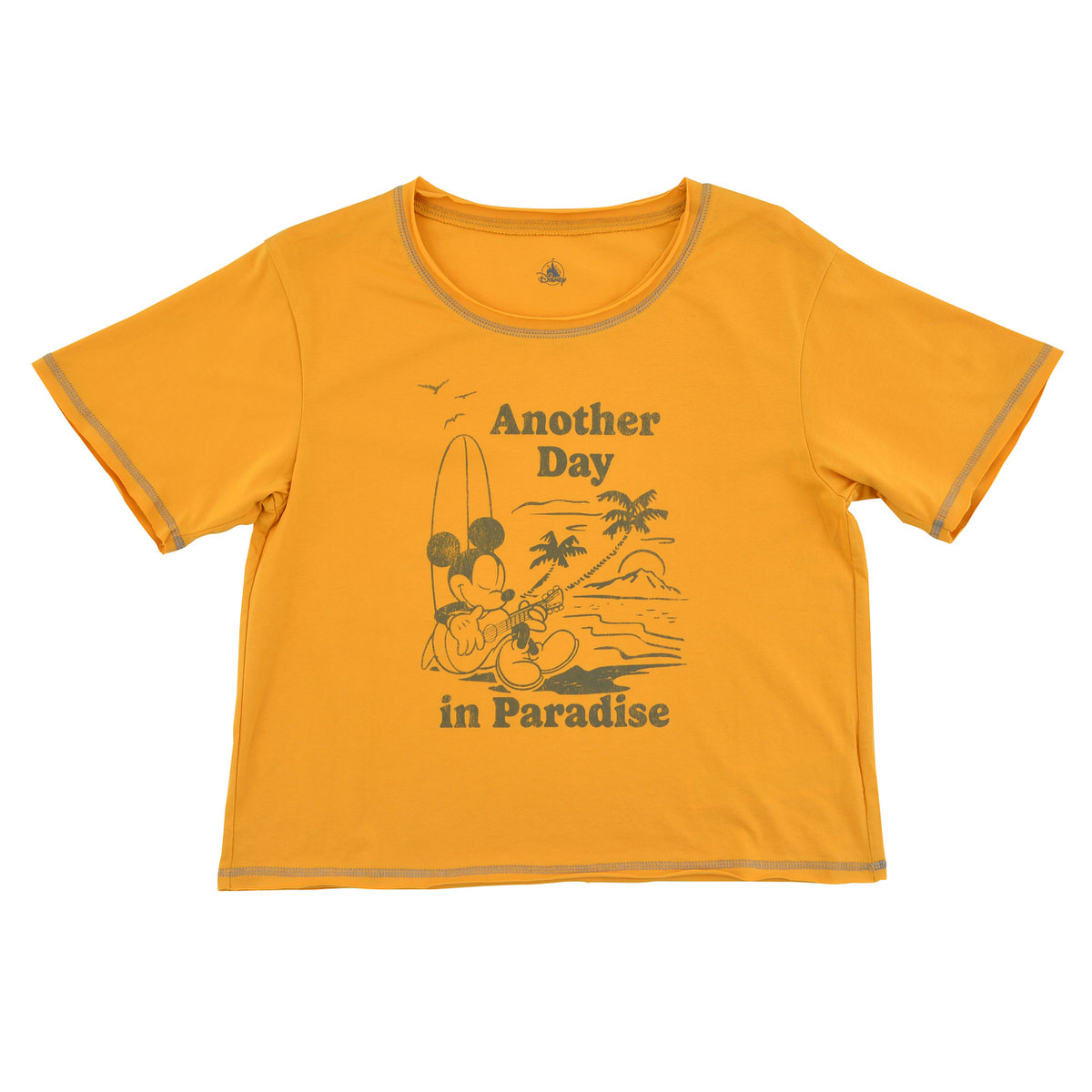 マスタードイエローのTシャツに、ビーチでバカンスを楽しむ「ミッキーマウス」がプリントされた半袖Tシャツ。
