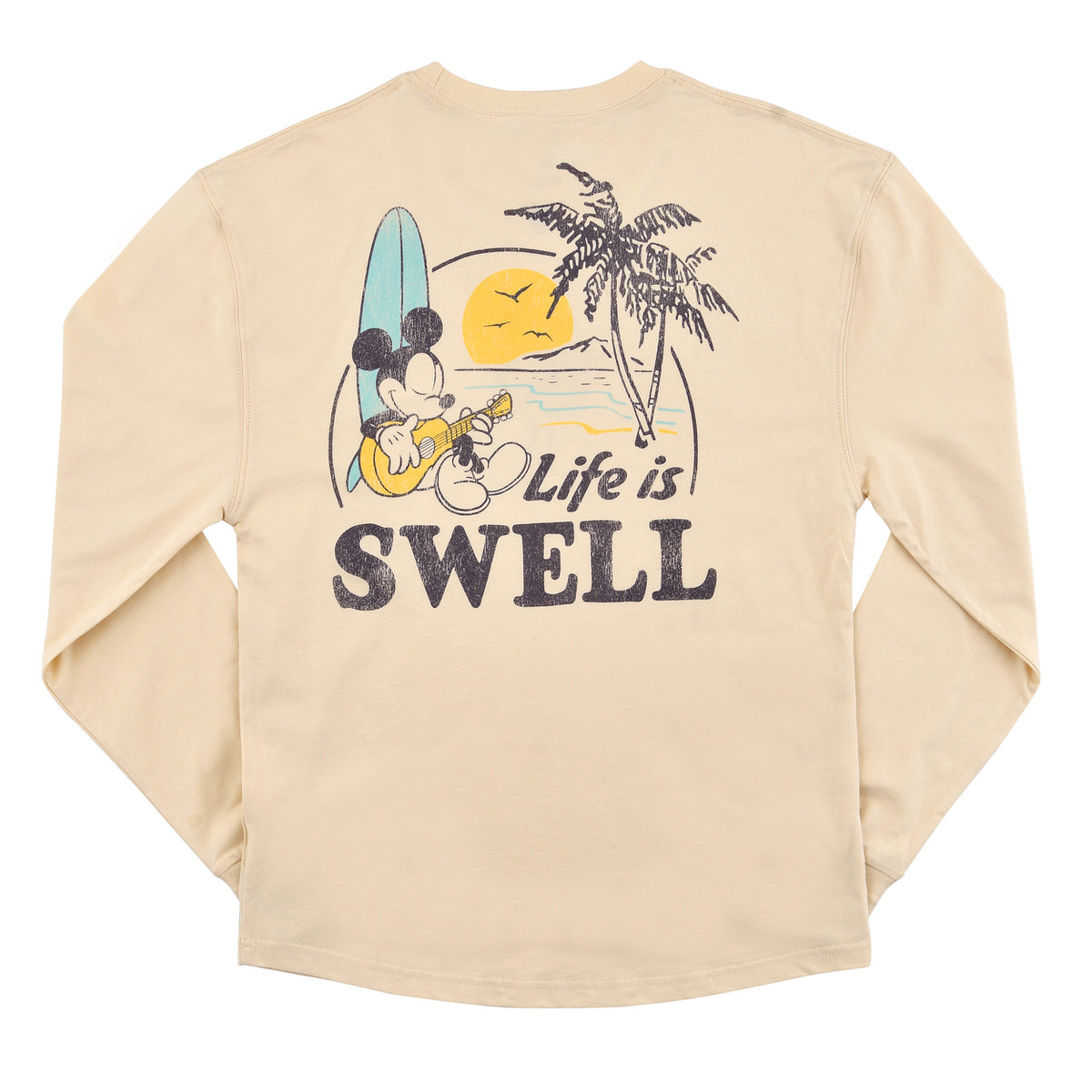 背面にプリントされた、サーフボードに寄りかかりながらウクレレを弾く「ミッキーマウス」がインパクト大!