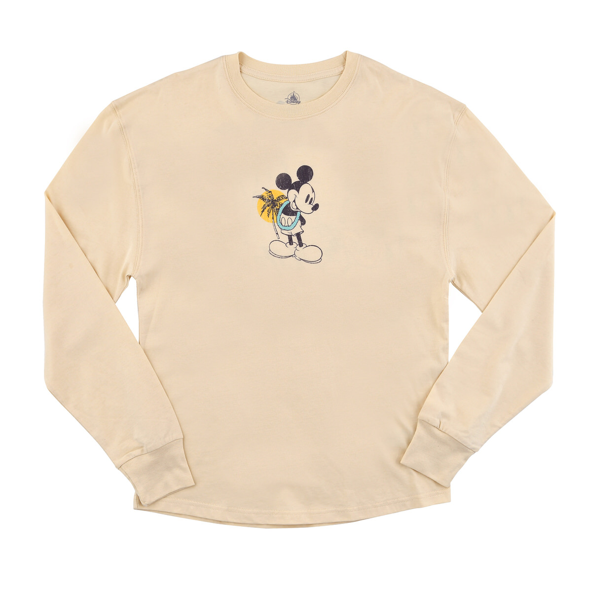フロント面にレイを首に掛けた「ミッキーマウス」がワンポイントでプリントされた長袖Tシャツ。