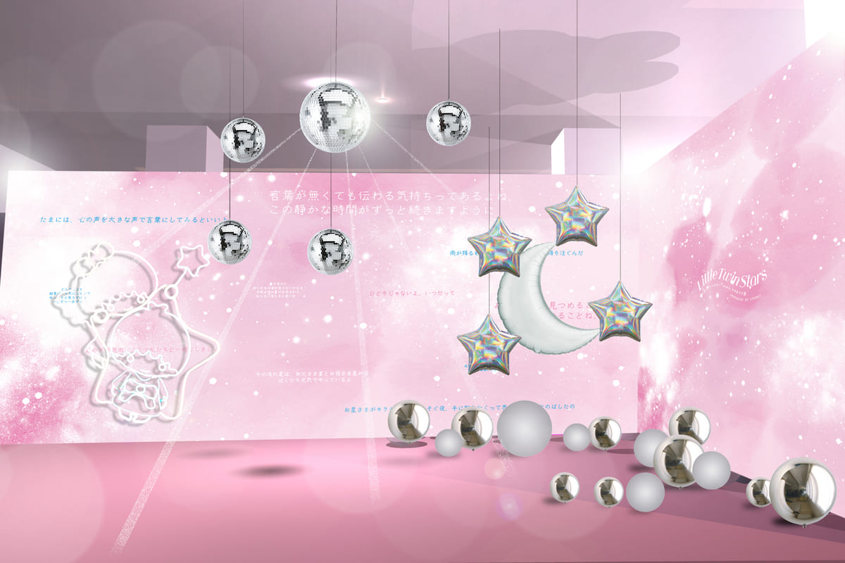 「キキ&ララ」の言葉が壁に散りばめられミラーボールに反射した光が降り注ぐ「星空のライトシャワー」ブースや、