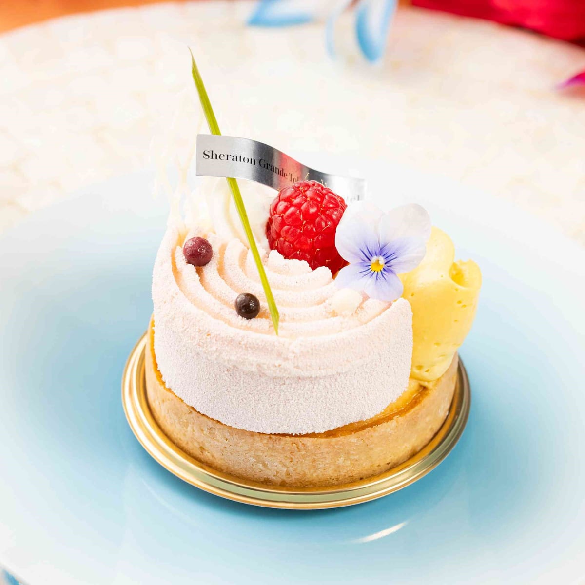 アプリコットのコンポートとチーズクラフティを入れ込んだタルト生地に、香り高いライチのゼリーを閉じ込めたグアバムースとマンゴークリーム、生クリーム、フランボワーズを飾り、仕上げにグリーンのレモングラスを挿し色に置いた特製タルト。