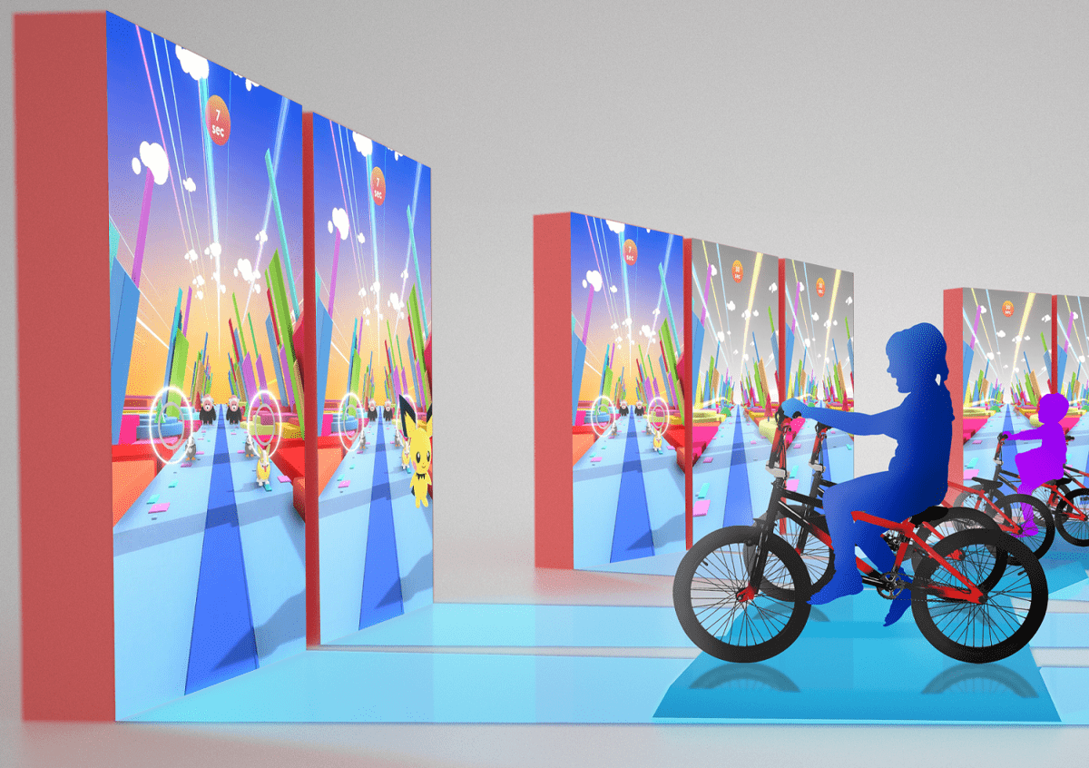 体験画面の前に設置された自転車をこいで道を進んでいくと「ポケモン」が!