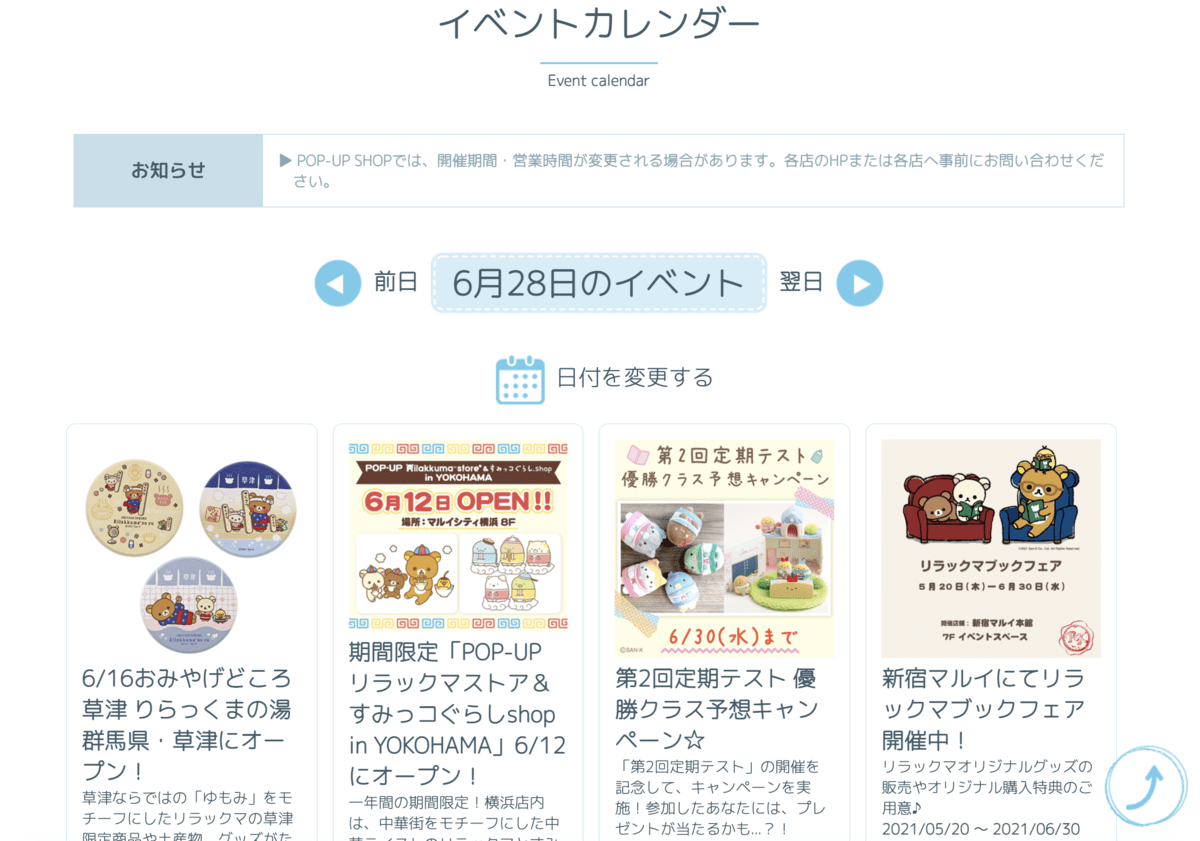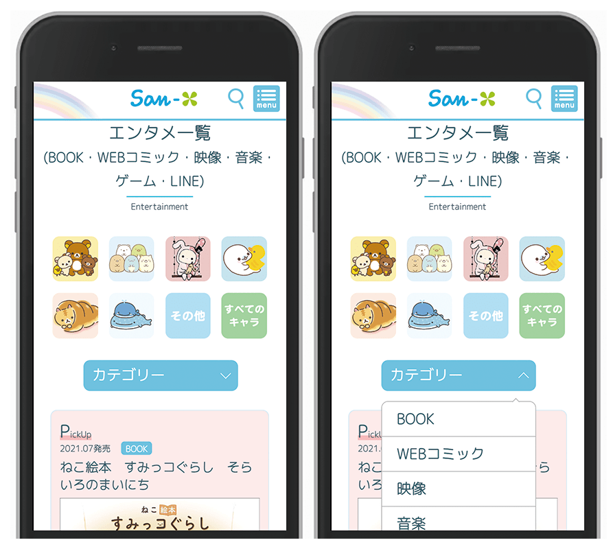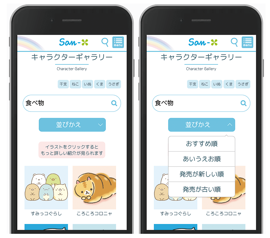 パソコン・スマートフォンどちらからでも、「リラックマ」「すみっコぐらし」などの人気キャラクター情報が、わかりやすくなっています!