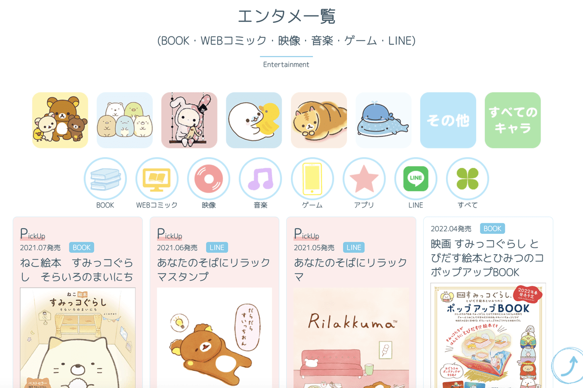 「エンタメ一覧」では、サンエックスキャラの本・映像・ゲーム・LINEスタンプなどの情報が見られます。