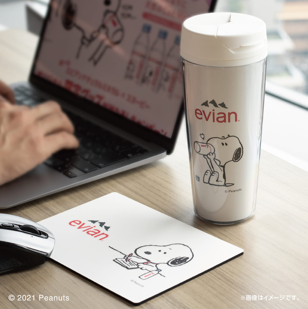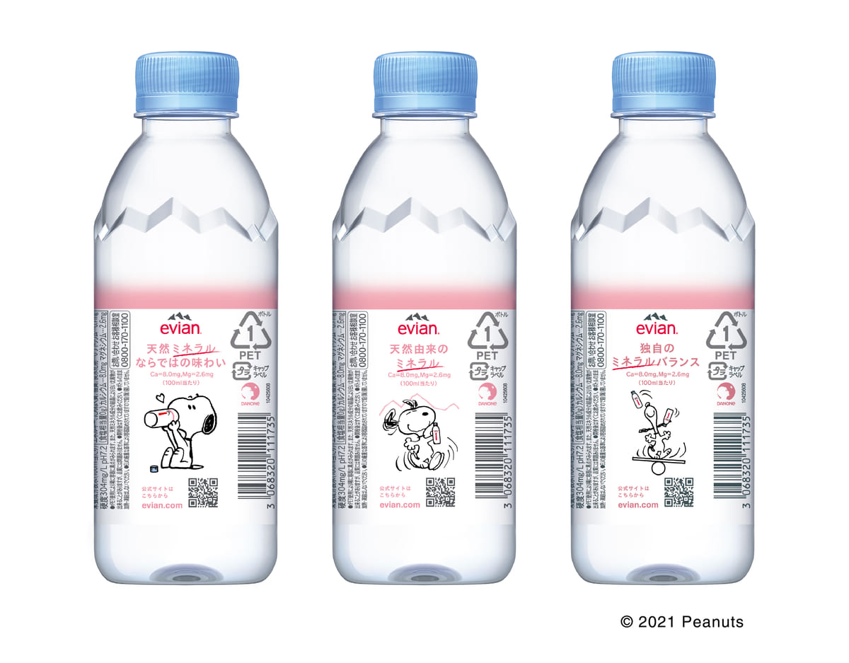 「いつもあなたの隣にいるスヌーピー」と、いつも人々の生活や活動の隣にある「エビアンの天然のカルシウムとマグネシウム」とが重なり、スペシャルなデザインボトルで発売中です。