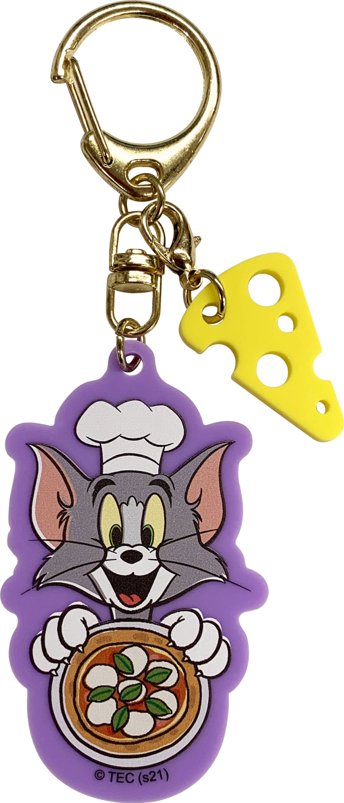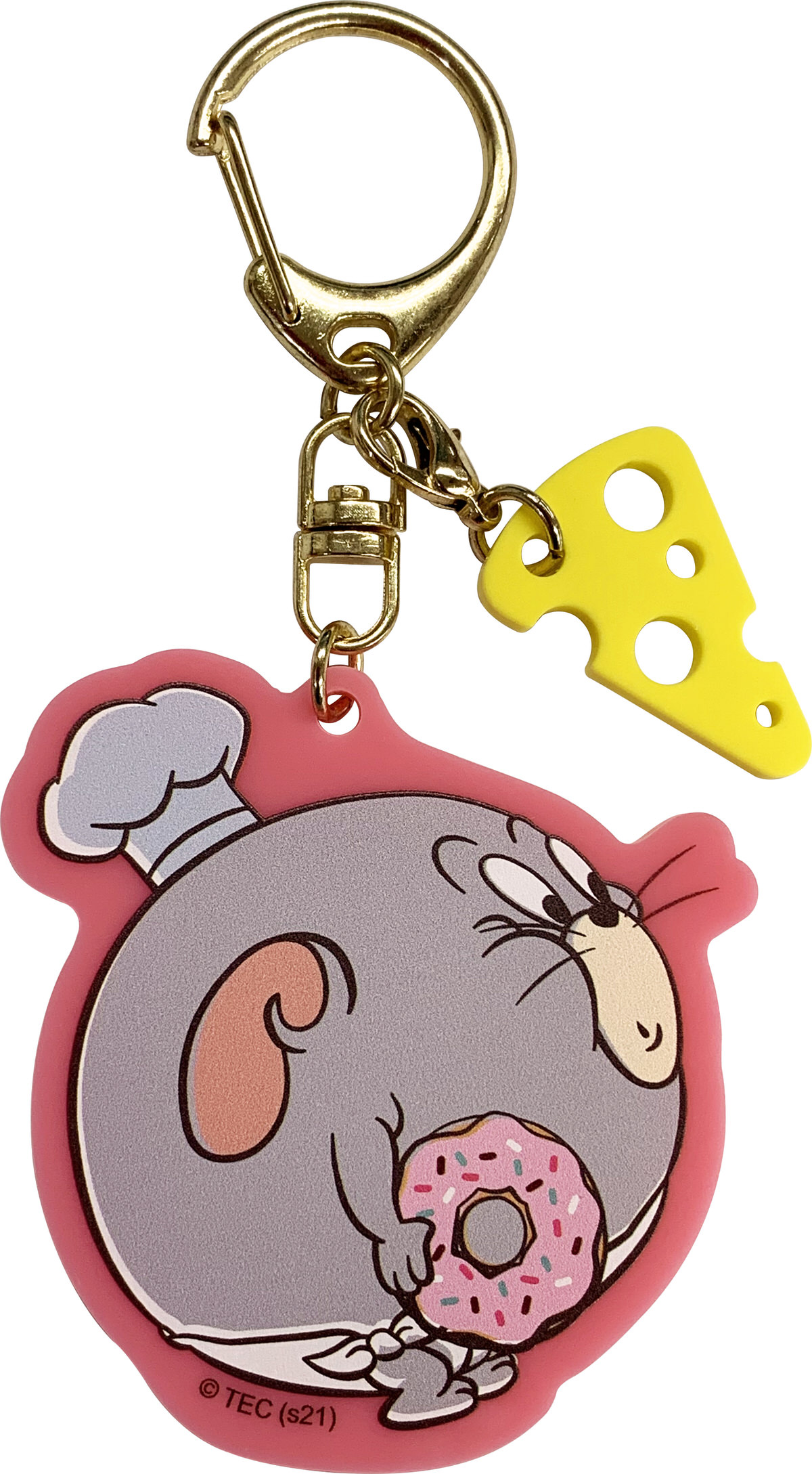 穴開きチーズのチャームが付いた、アクリルキーホルダー。
