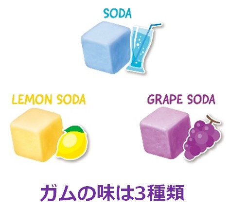 3種類の人気の炭酸飲料(ソーダ、グレープソーダ、レモンソーダ)のすっきりした味わいが楽しめるアソートタイプのガムです。