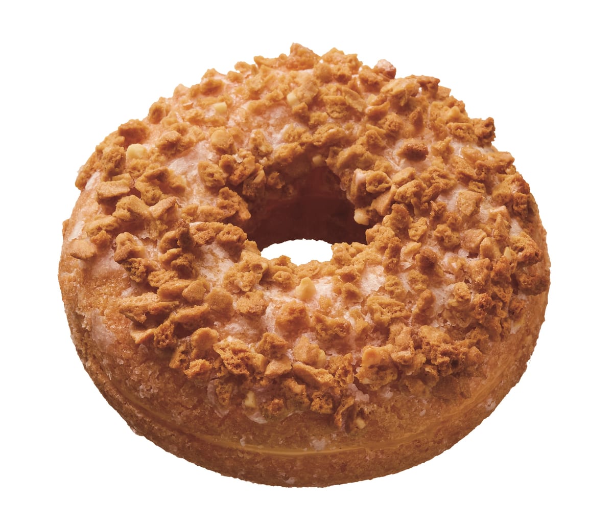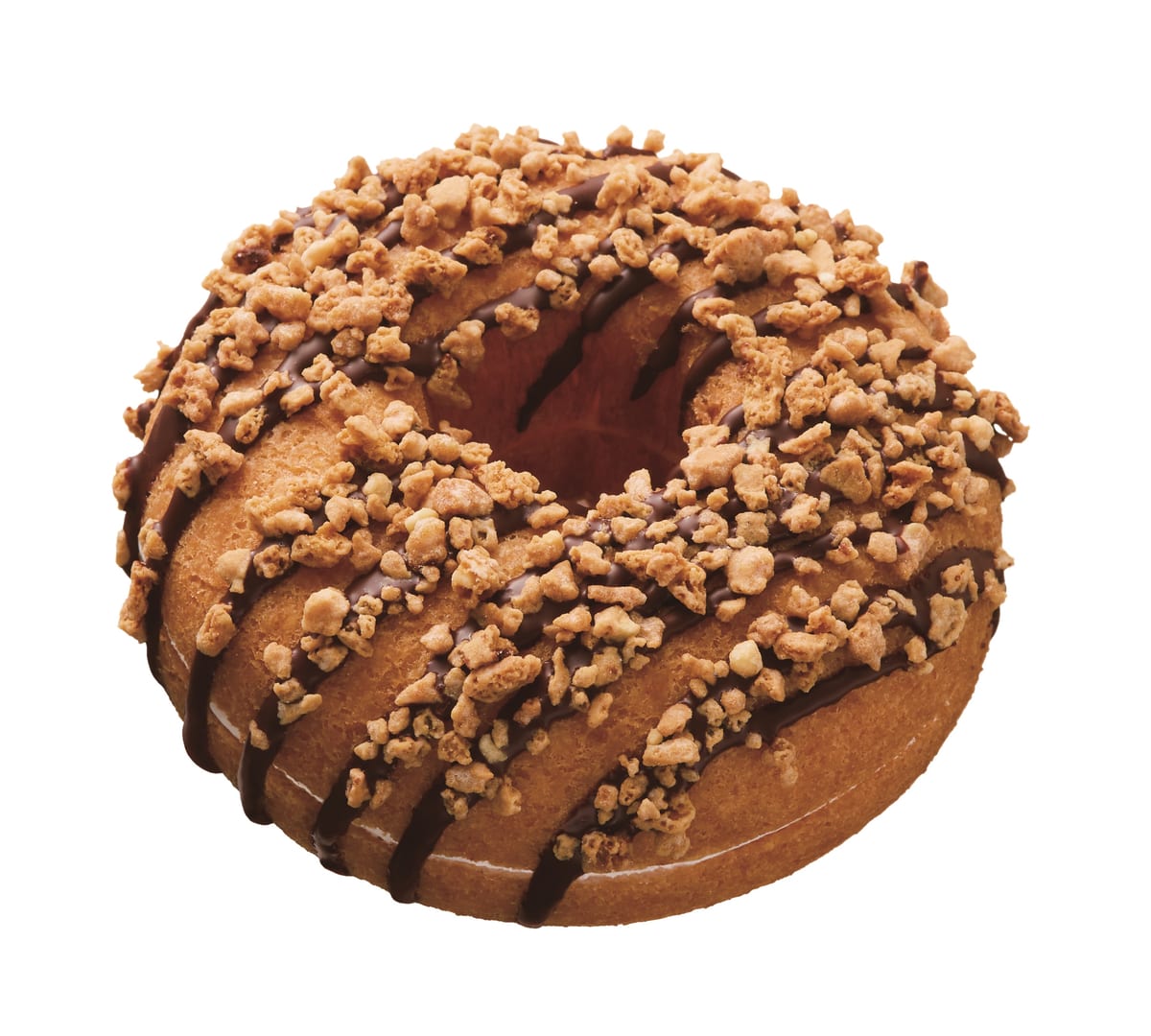 チョコレートでコーティングしたポン・デ・リング生地に、グレーズをからめて焼き上げたアーモンドクランチをトッピング。