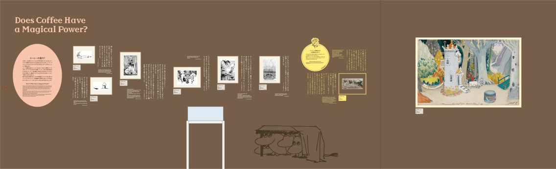 展示構成は、知的好奇心を誘う「ムーミン」の原作アートと、象徴的な「ことば」から「コンヴィヴィアル」を感じる四季折々の食の視点、ムーミンの物語と深くつながりのある作者の故郷である北欧を象徴する食べもの「コーヒー」「ジャム」「パンケーキ」などから選定。