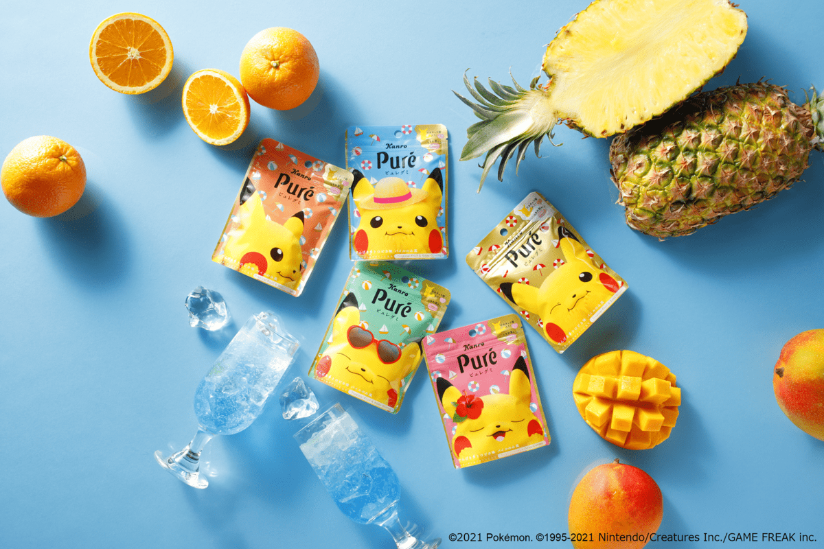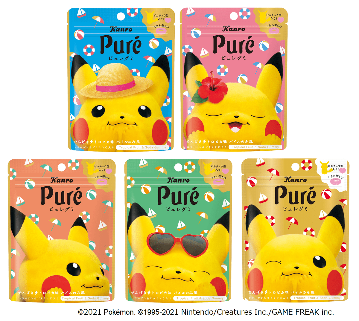 「パイルのみ」をイメージした、夏おすすめのトロピカルな味わいのグミを詰め込んだ、カラフルな「ピカチュウ」モチーフのパッケージ5種類が展開されます☆