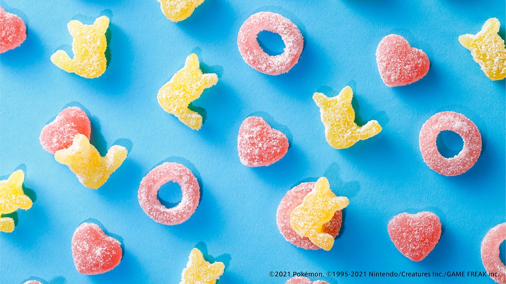 「ピュレグミポケモン でんげきトロピカ味パイルのみ風」には、ランダムで「ピカチュウ型」「うきわ型」「ハート型」の3種類のグミ粒が入っており、組み合わせることで楽しさが増す仕掛けとなっています。