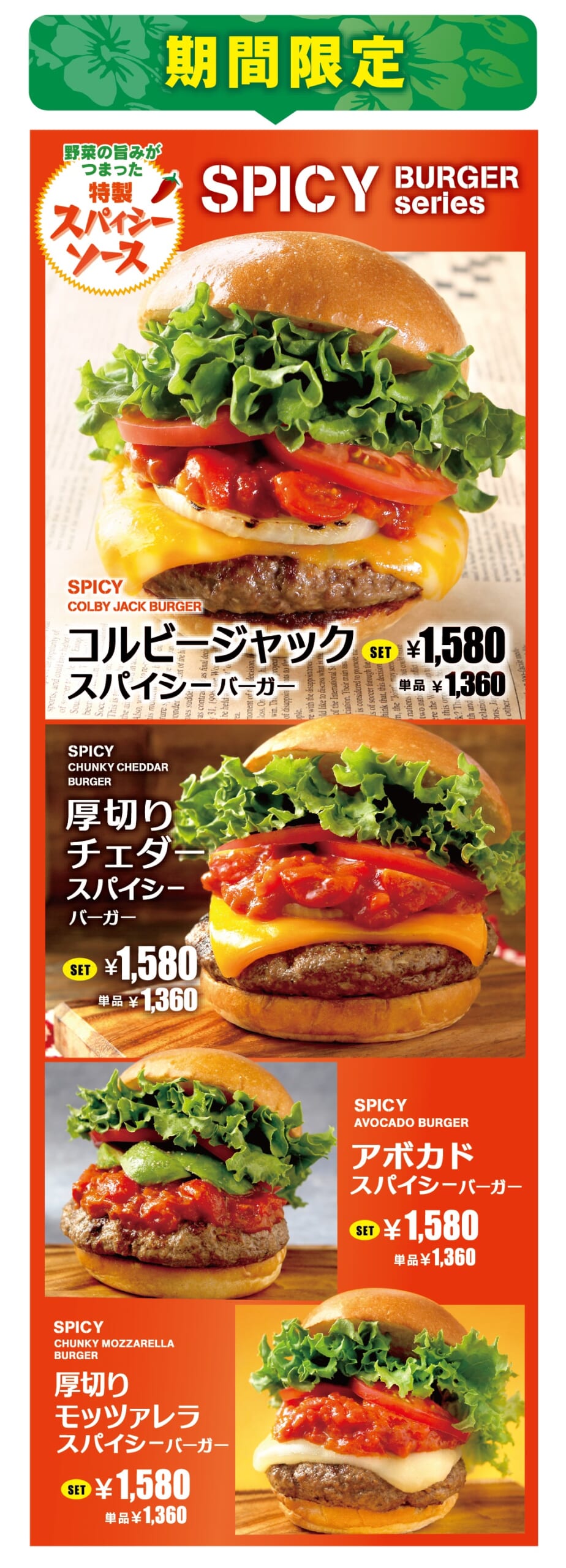さらに毎年人気を博している、チーズのコクがソースと相性抜群「厚切りチェダー スパイシーバーガー」、ミルキーなモッツァレラチーズがスパイシーソースを優しく包む「厚切りモッツァレラ スパイシーバーガー」、とろける食感の完熟アボカドが口に広がる「アボカド スパイシーバーガー」も登場です☆