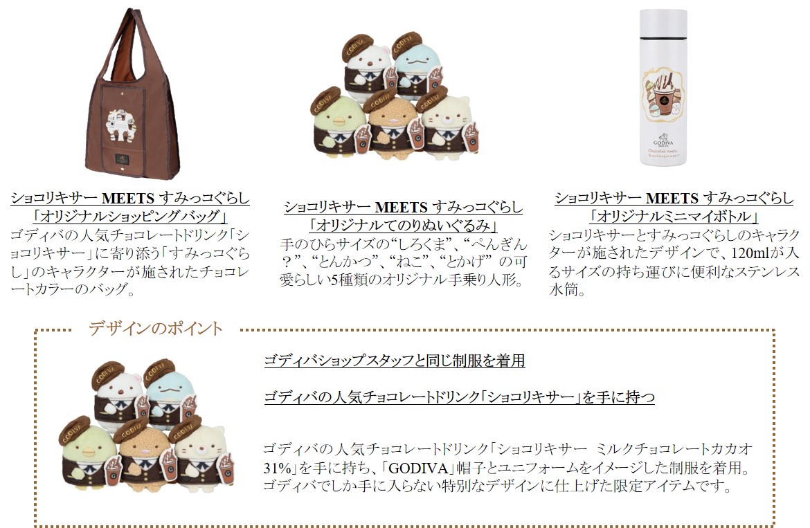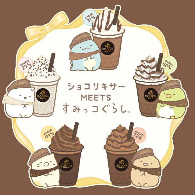 ゴディバの味わい深い贅沢なチョコレートドリンクと心温まる「すみっコぐらし」がコラボレーションしたアイテム3種がラインナップ。