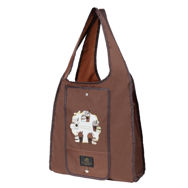 ゴディバの人気チョコレートドリンク「ショコリキサー」に寄り添う「すみっコぐらし」のキャラクターが施されたチョコレートカラーのバッグ。