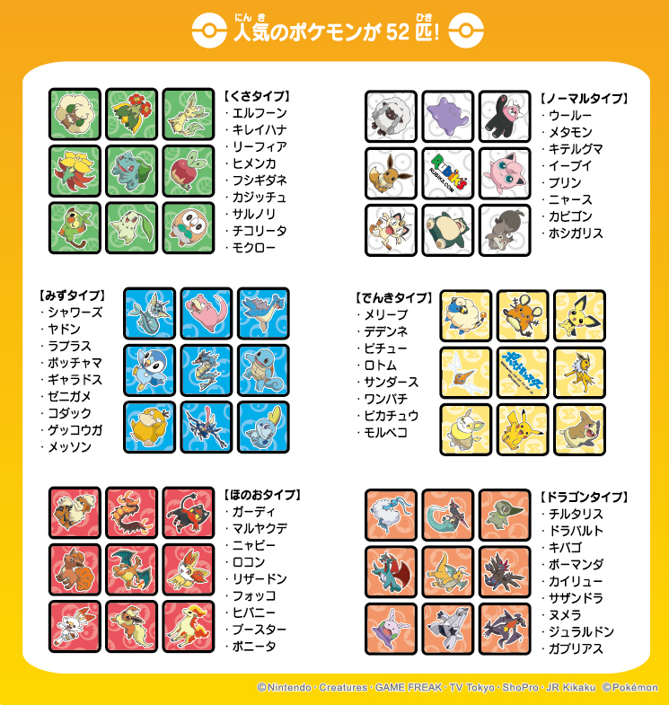 52匹の「ポケモン」たちが、6つのタイプごとに色分けされています。