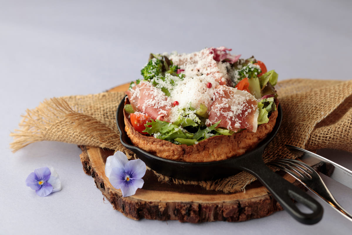 パンケーキの上にお野菜や生ハム、チーズをのせた「二乃の旬の野菜と生ハムのダッチベイビー」
