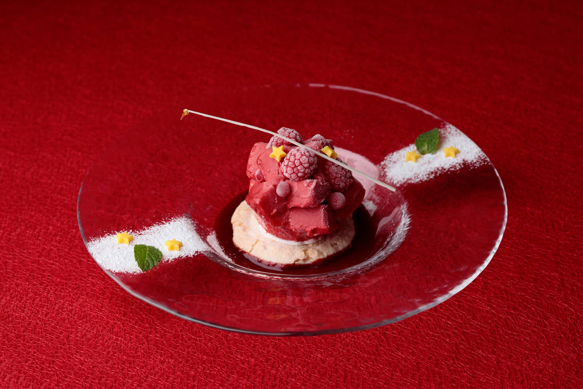 下にバラ風味のアイスクリーム、中央にライチのムースをのせたアイスデザート。