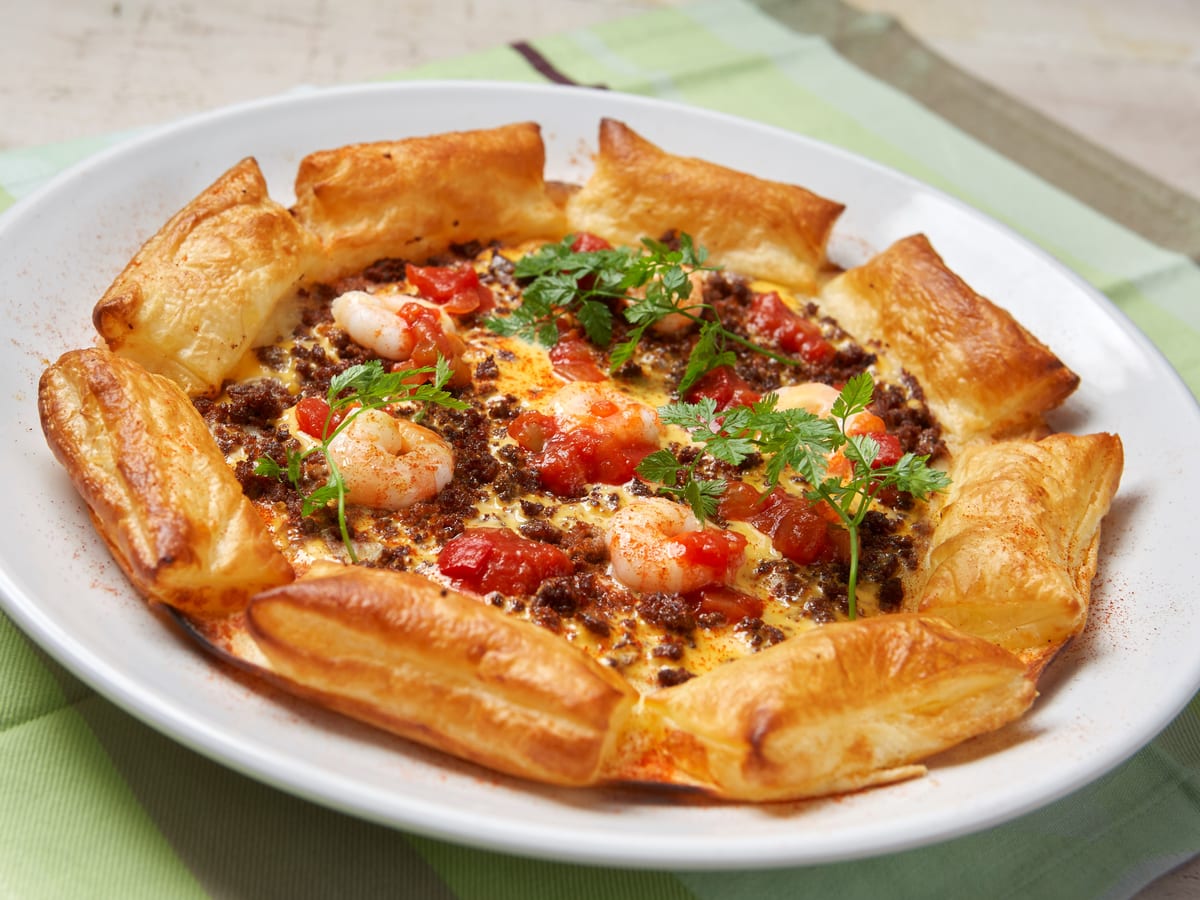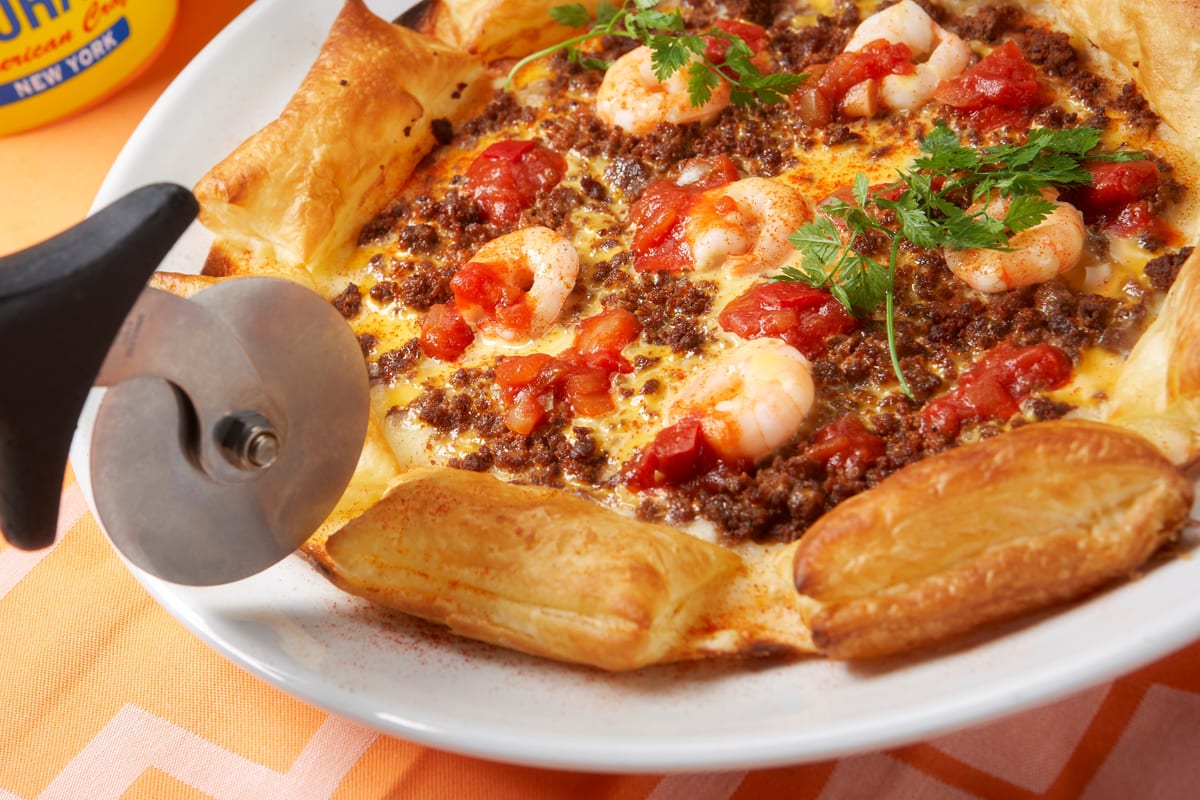 クリスピーな食感の生地にクワトロチーズをたっぷりと使い、スパイシーな牛ひき肉に海老を乗せて焼き上げたピザです。