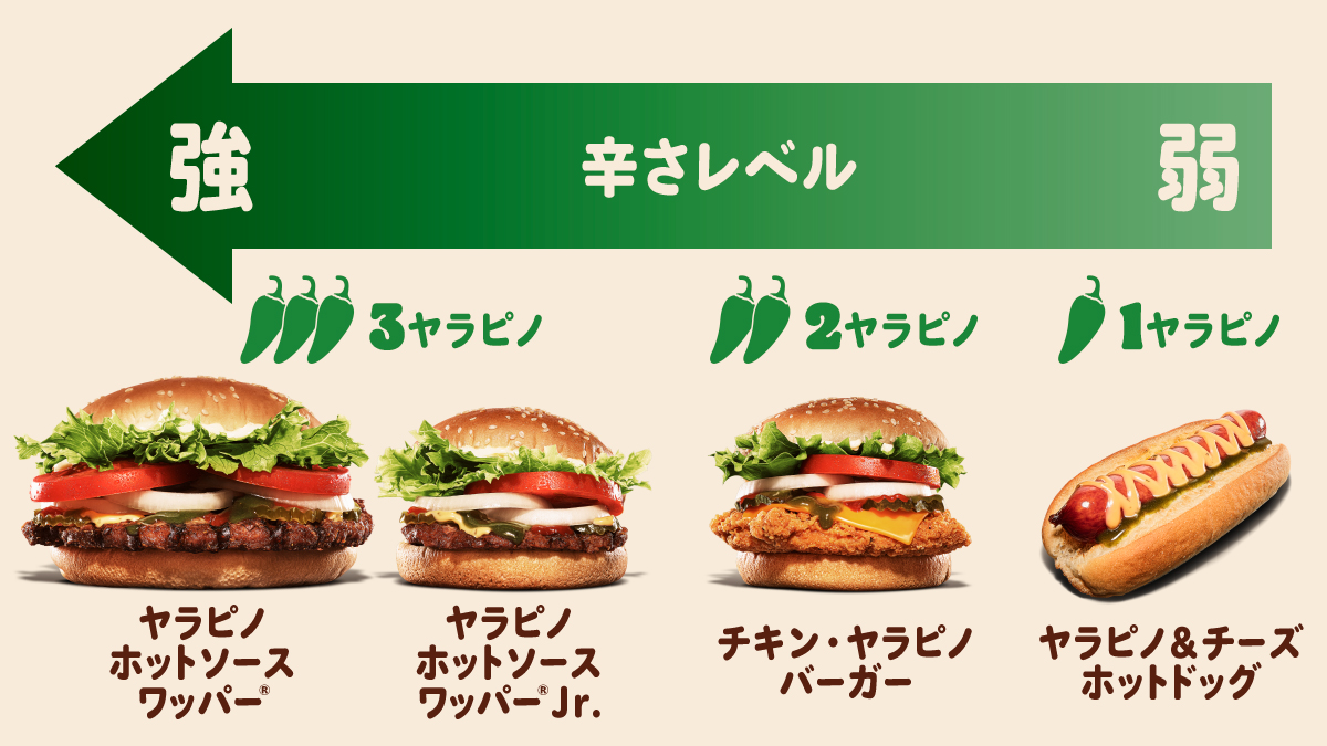 夏にぴったりのキレの良い辛さがビーフの旨みを引き立てる「ヤラピノホットソースワッパー」をはじめ、食べやすい大きさの「ヤラピノホットソースワッパーJr.」、チキンとの組み合わせが楽しめる「チキン・ヤラピノバーガー」、ソーセージとチーズでまろやかな辛さの「ヤラピノ&チーズ ホットドッグ」が期間限定で登場します。