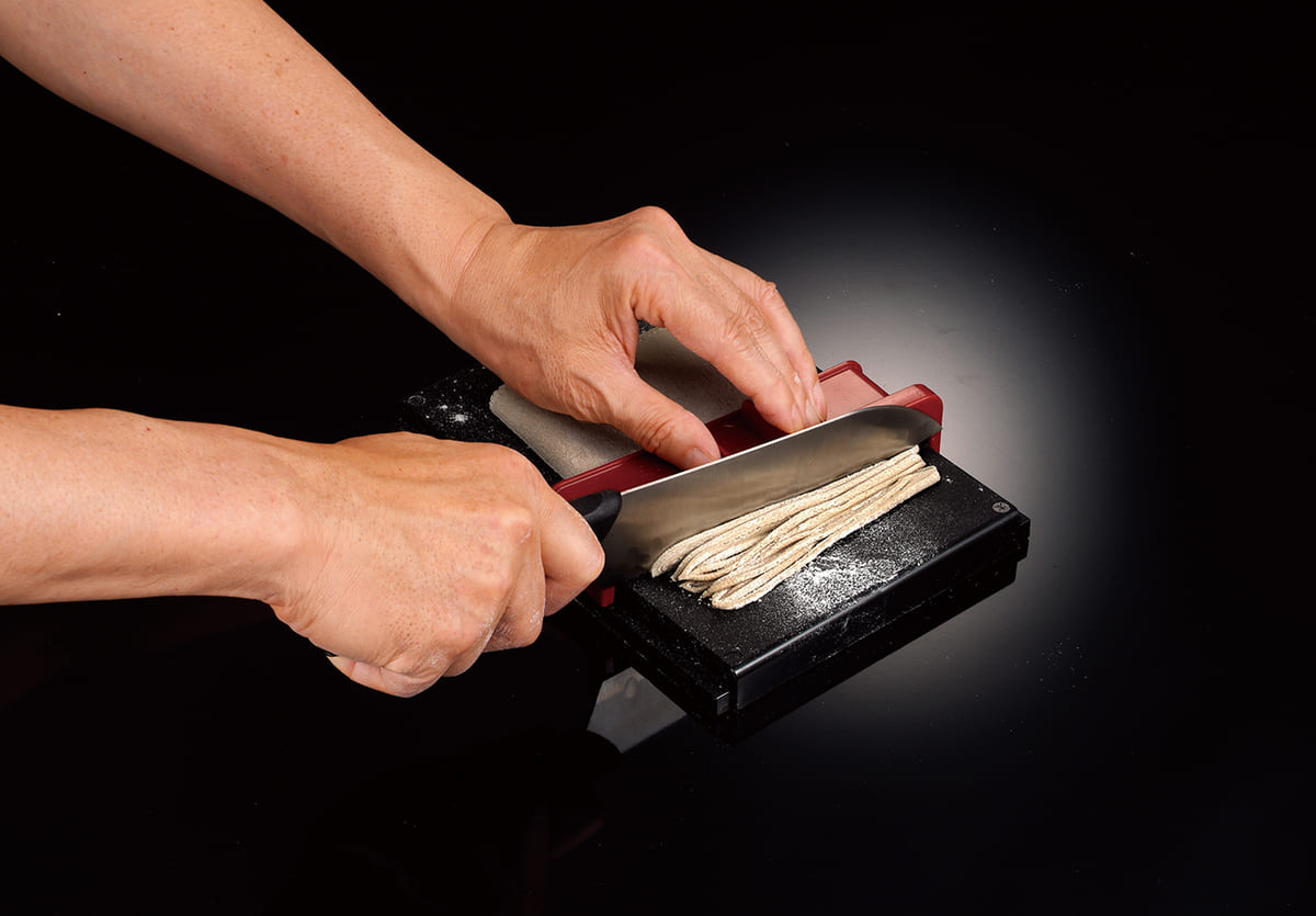 「厚み調節ガイド」と「のし板」により均一な厚さにそば生地を延ばせます。