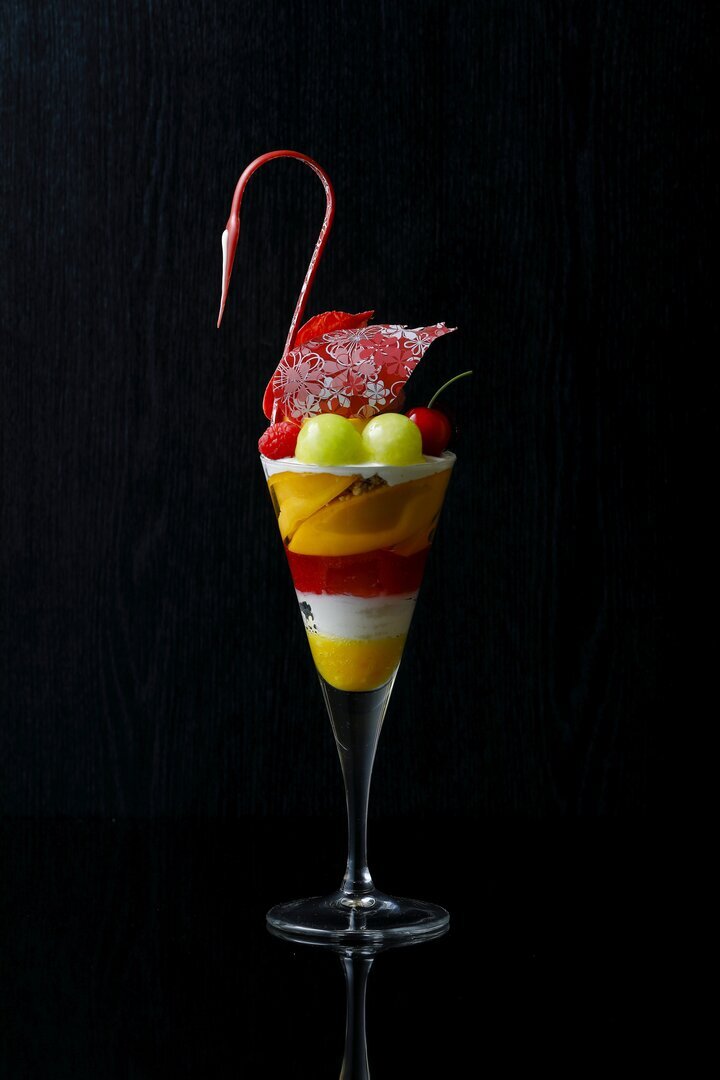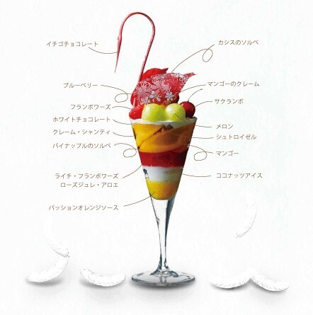彩り豊かなマンゴー、メロン、さくらんぼ、フランボワーズなどのスイーツとパイナップル、カシス、ココナッツの素材の美味しさを活かしたソルベ・アイスなどでカラフルな層をなすグラス。