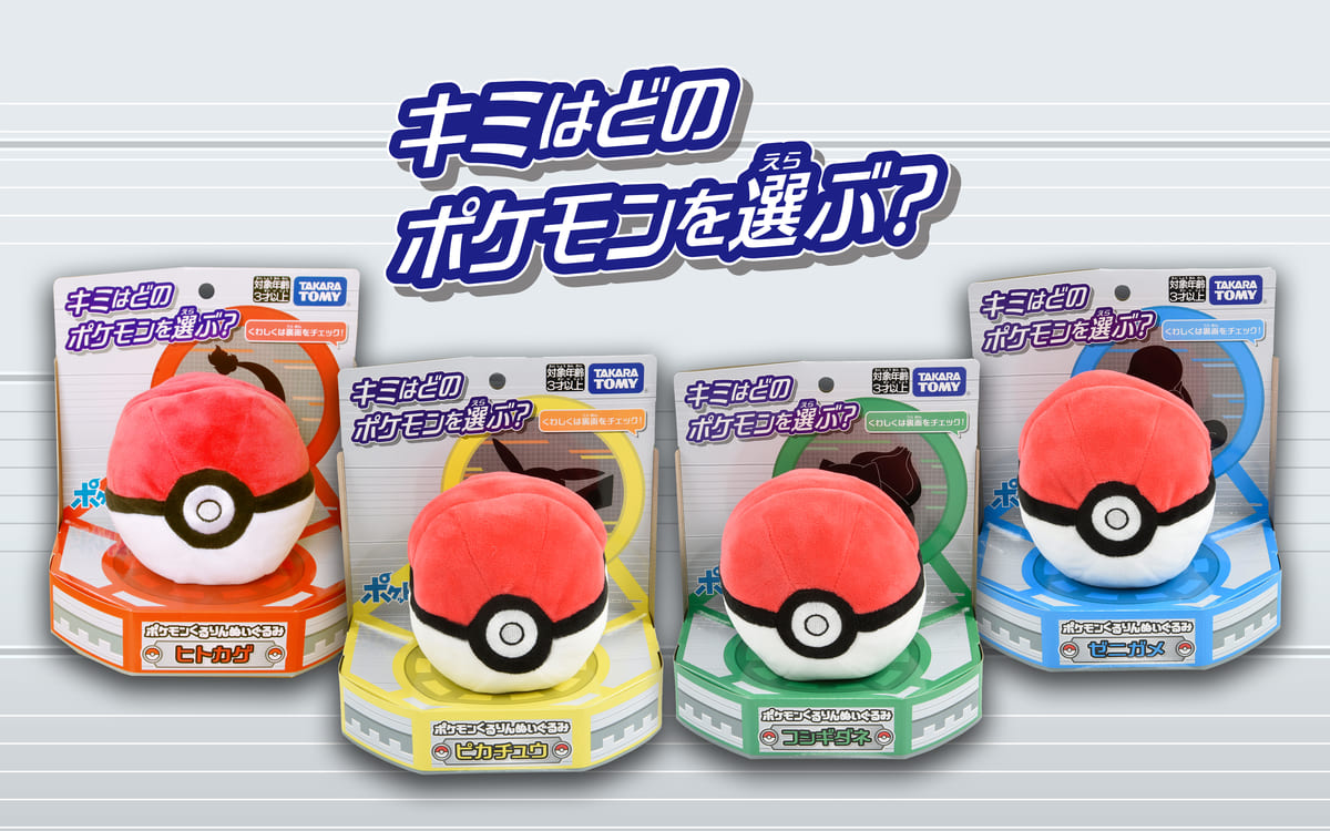 「ピカチュウ」「フシギダネ」「ヒトカゲ」「ゼニガメ」の4種類が登場し、「モンスターボール」から”くるりん”と変形と、「ポケモン」の姿に変形するぬいぐるみです。