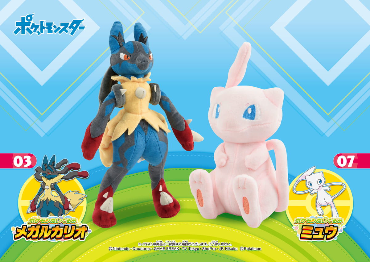 ポケモンぬいぐるみ「サトシのピカチュウ/コハルのイーブイ/メガルカリオ/ミュウ」