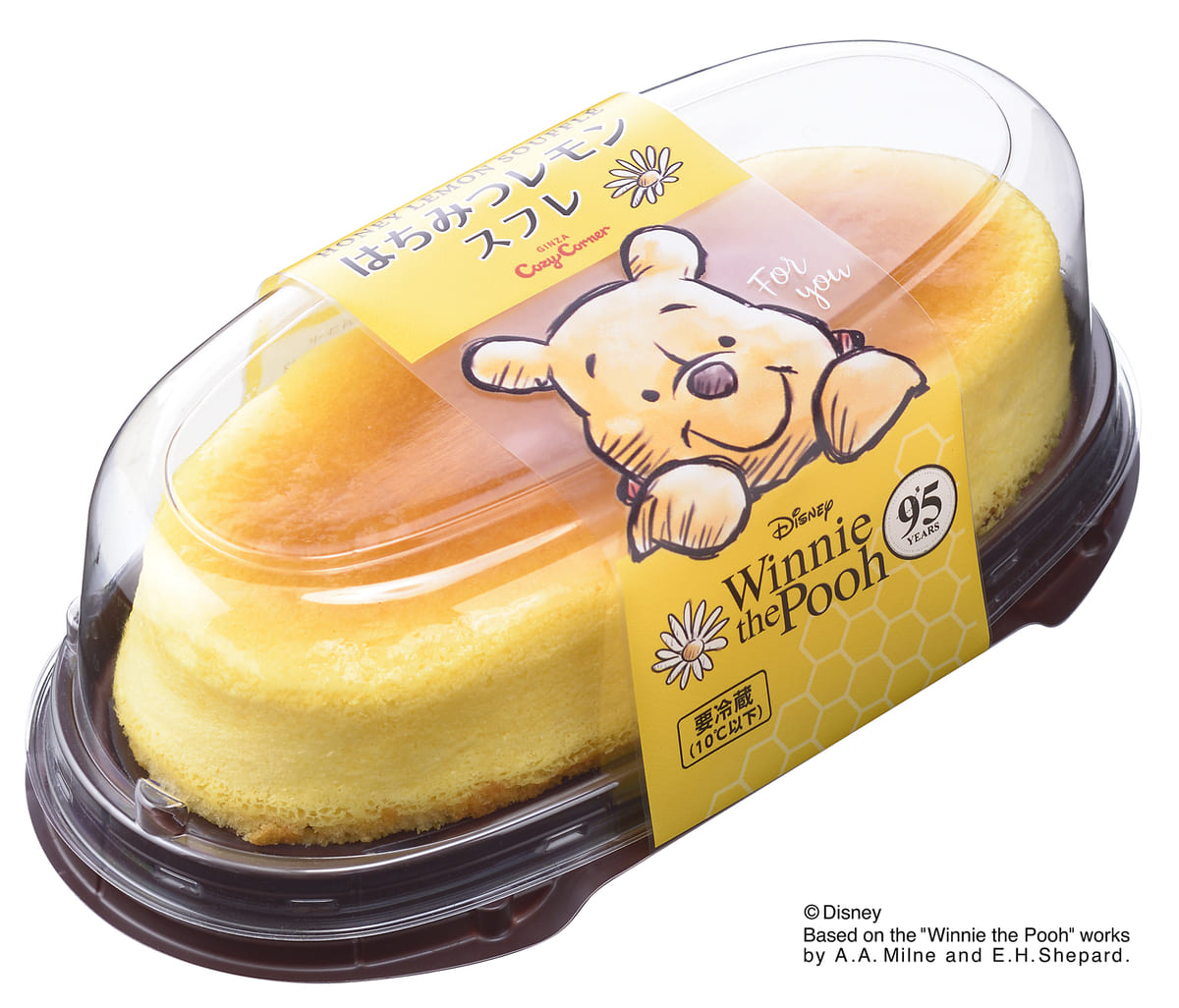 「くまのプーさん」が巻きフィルムにデザインされた、季節限定のレモンチーズスフレ。