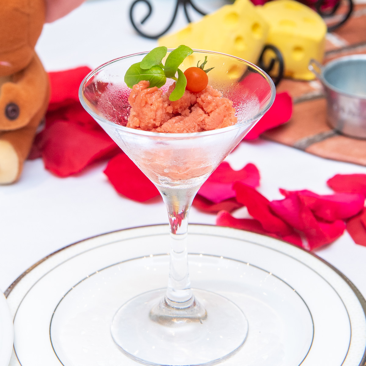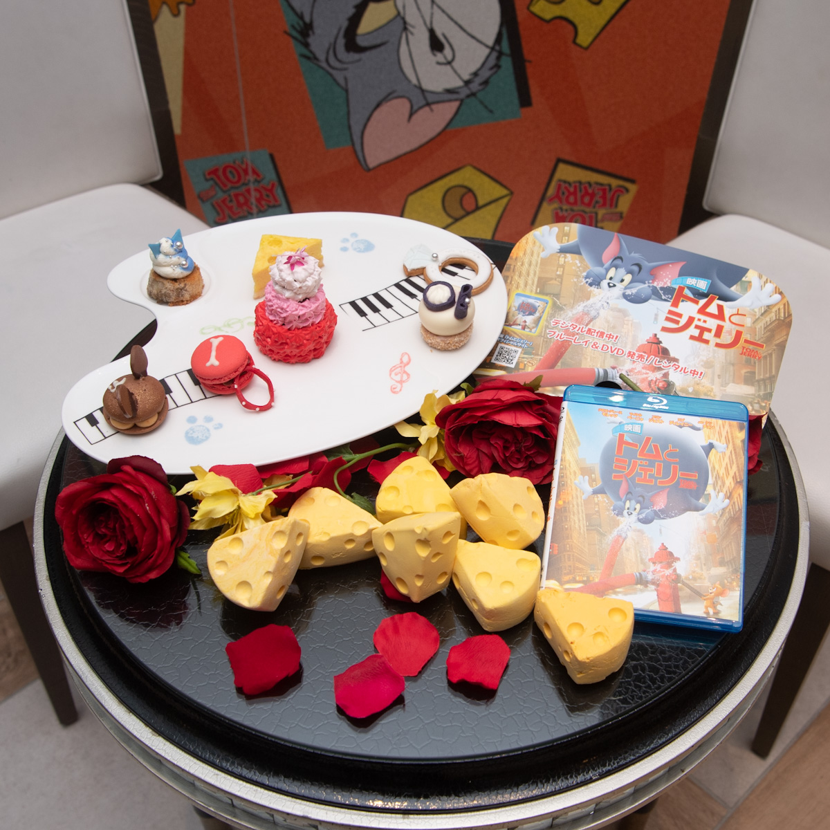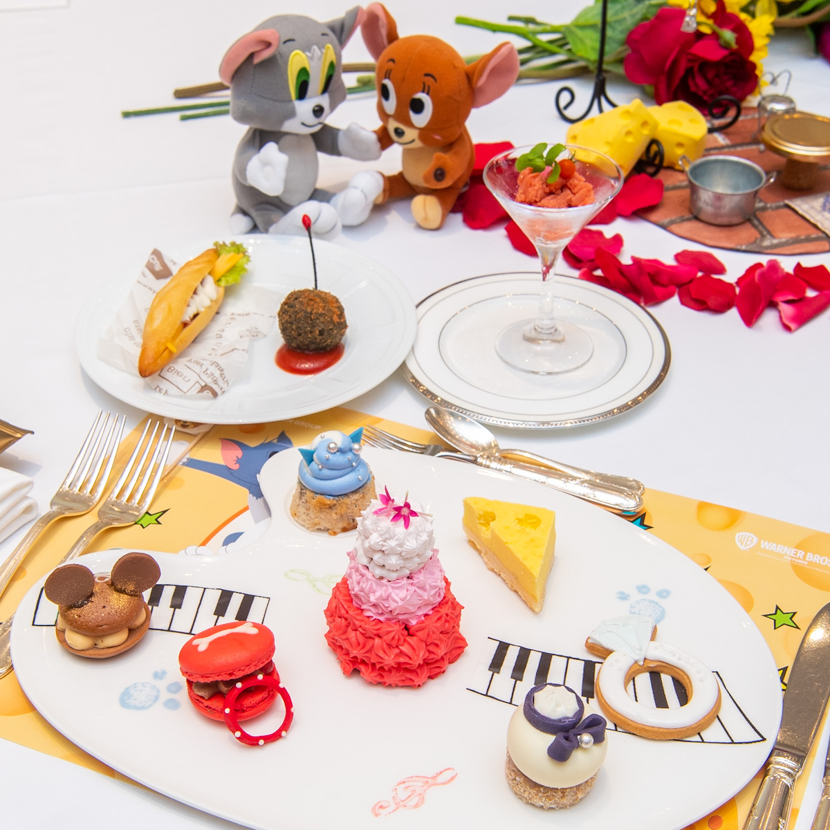 劇中で描かれる “結婚式”をイメージした「幻のウェディングケーキ」や「ダイヤモンドの指輪」、「トム」が奏でるピアノや、「ジェリー」が大好きな穴あきチーズなど、映画の世界観からインスパイアされたスイーツ&セイボリーはすべて、専属パティシエがこのために制作したオリジナルです。