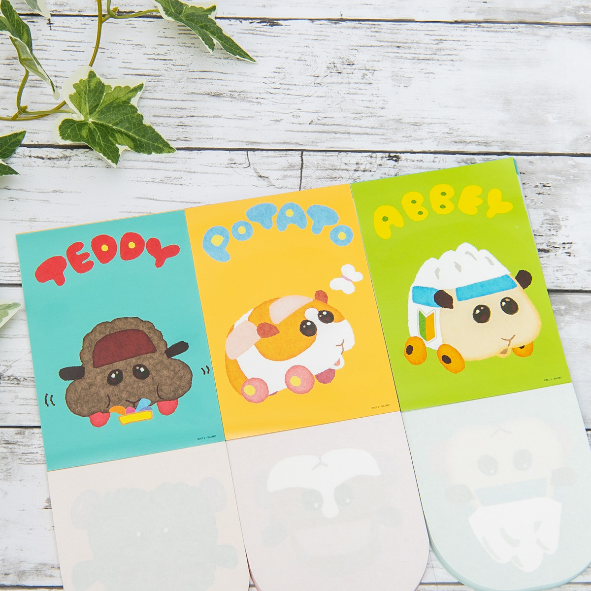 食いしん坊な「テディ」、のんびり屋で勇敢な「ポテト」、もこもこなヘアスタイルの「アビー」のダイカットメモです。