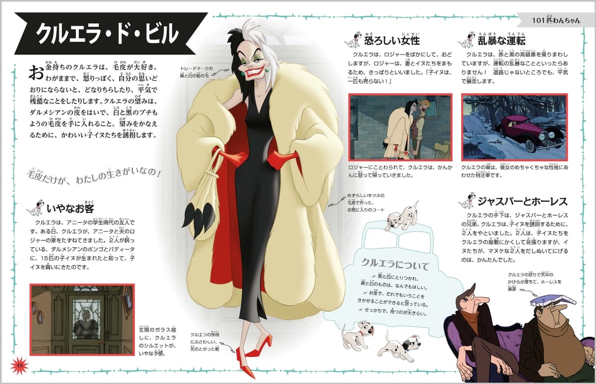ヴィランズの中でも抜群なファッションセンスを持つ「クルエラ」のページや