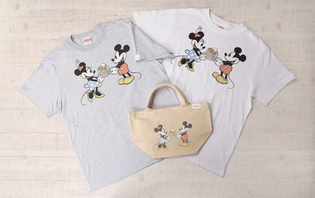 いずれもパンケーキを手にキュートな表情を見せる「ミッキーマウス」と「ミニーマウス」のアートをあしらい、サラベスのロゴタグでアクセントをつけた、サラベスとのコラボならではのオリジナルグッズです。