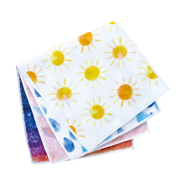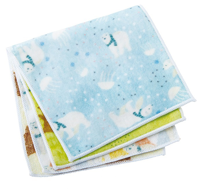 中央でとじられた4枚のタオルには、それぞれ違う絵柄をデザイン。