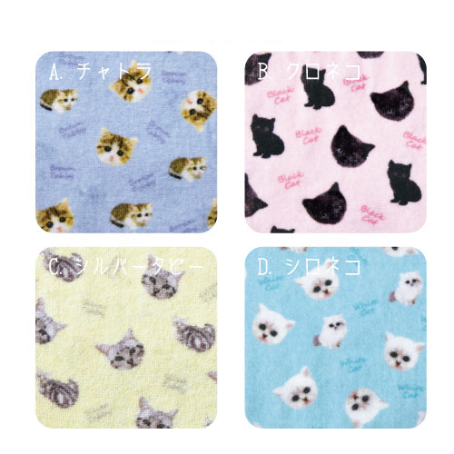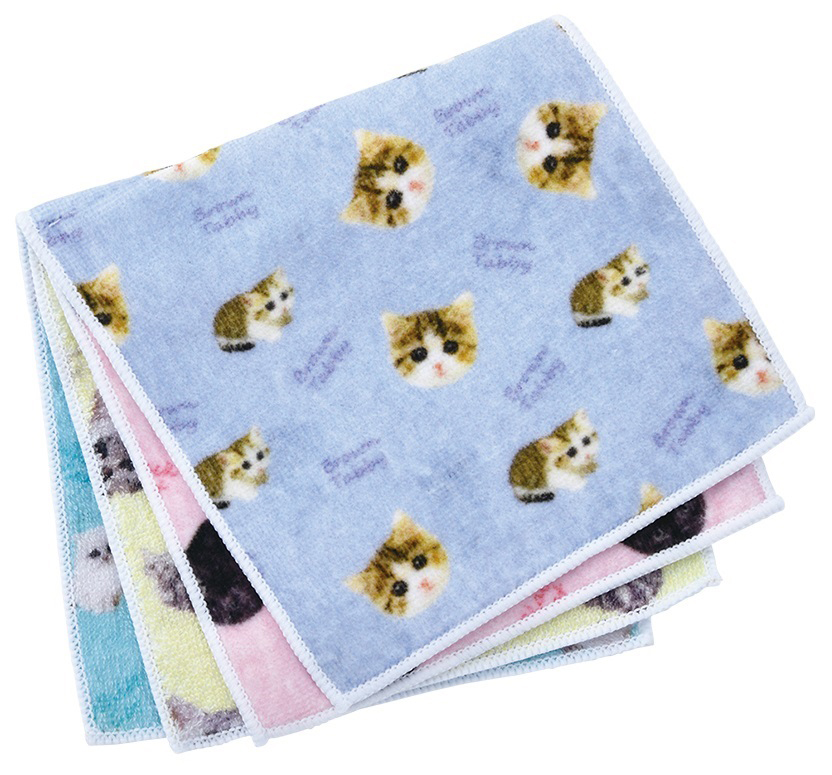 茶トラに黒猫、4種類の模様のネコちゃんが楽しめるハンカチ。