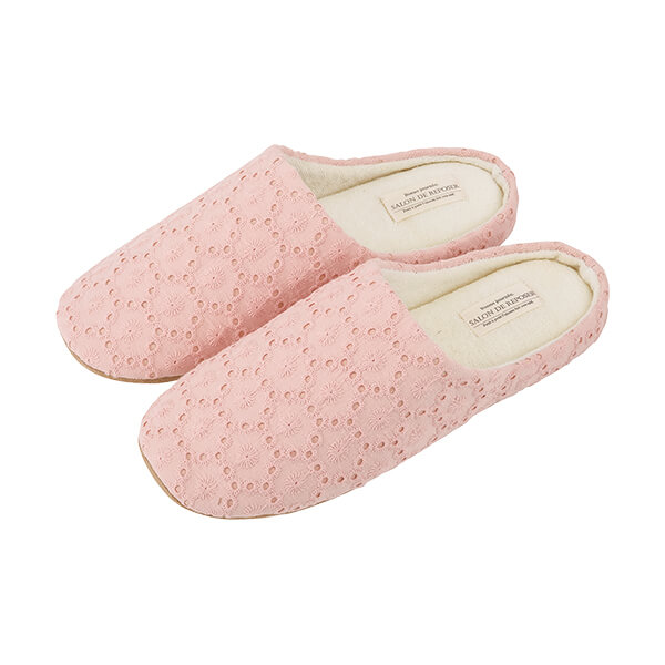 レース素材を使った、パステルカラーのルームシューズ。