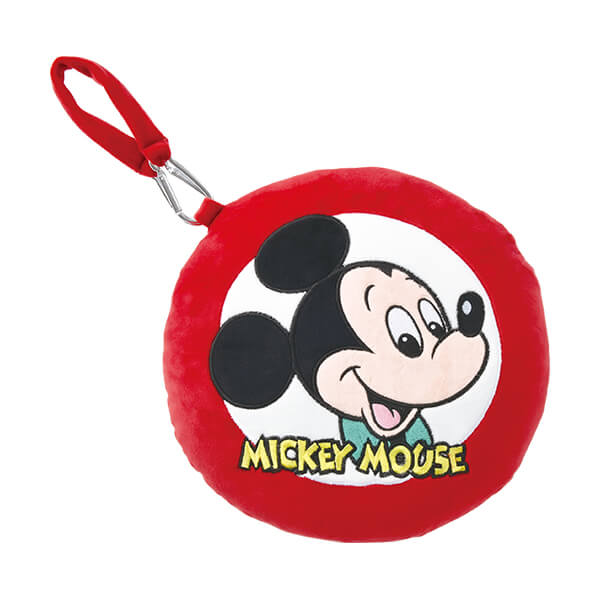 「ミッキーマウス」の2WAYクッションは、ラウンドクッションの縁とループがレッド。