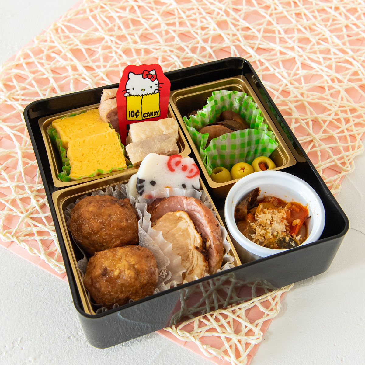 「ハローキティ」のお顔型のかまぼこのほか、お肉料理を中心としたラインナップ。