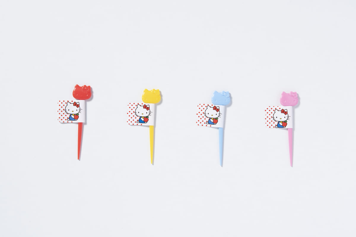 赤、黄、青、ピンクの4色で、トップには「ハローキティ」のお顔がデザインされています。