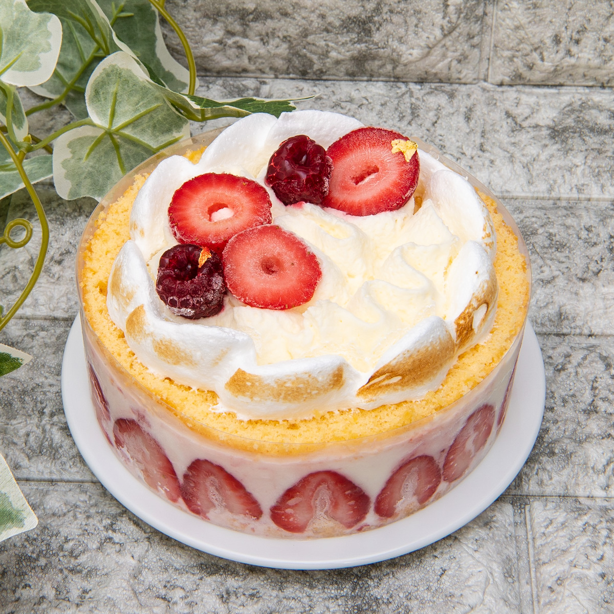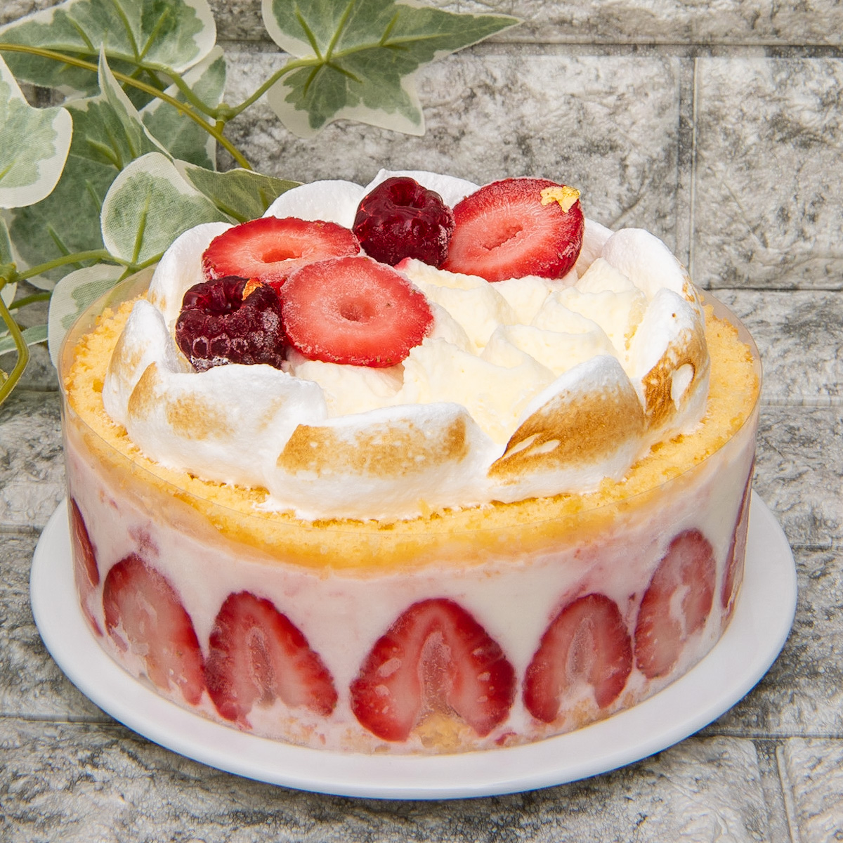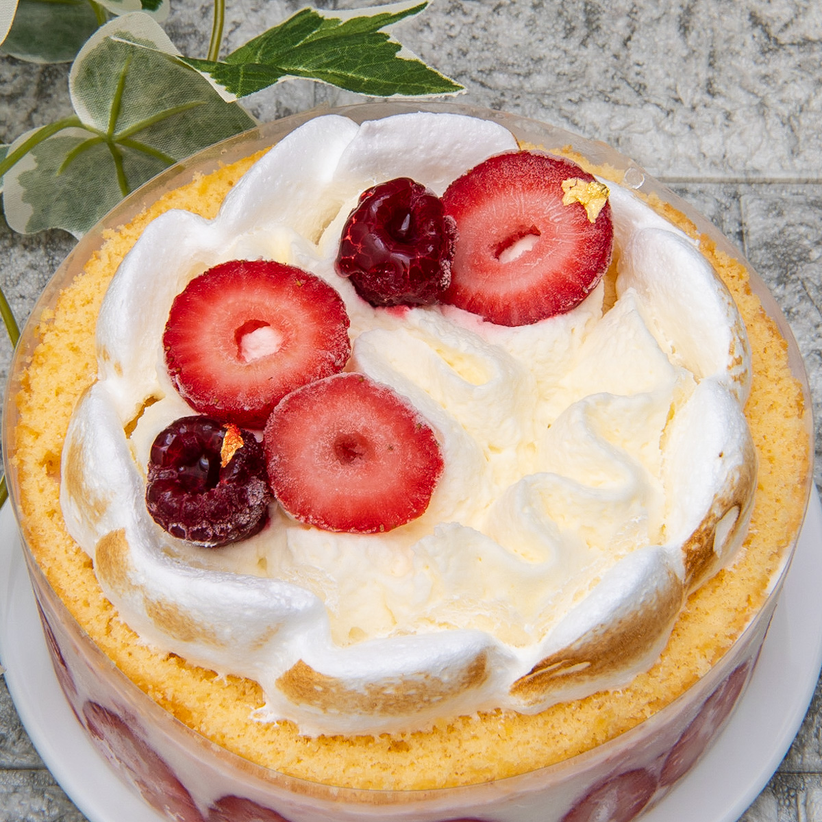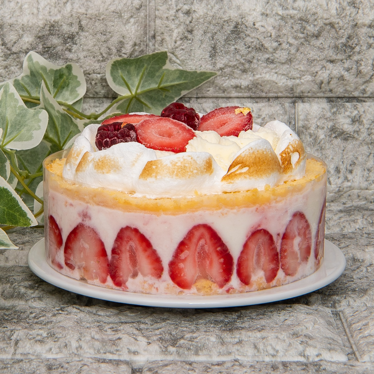 生クリームがたっぷり入ったいちごミルクアイスクリームをスポンジでサンドし、上には表面をほんのりと焦がした、イタリアンメレンゲでデコレーション。