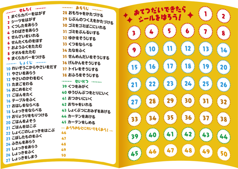 50種類のお手伝いが書かれた台紙とシールのセットで、楽しみながらおうちの方のお手伝いができるシールブックです☆