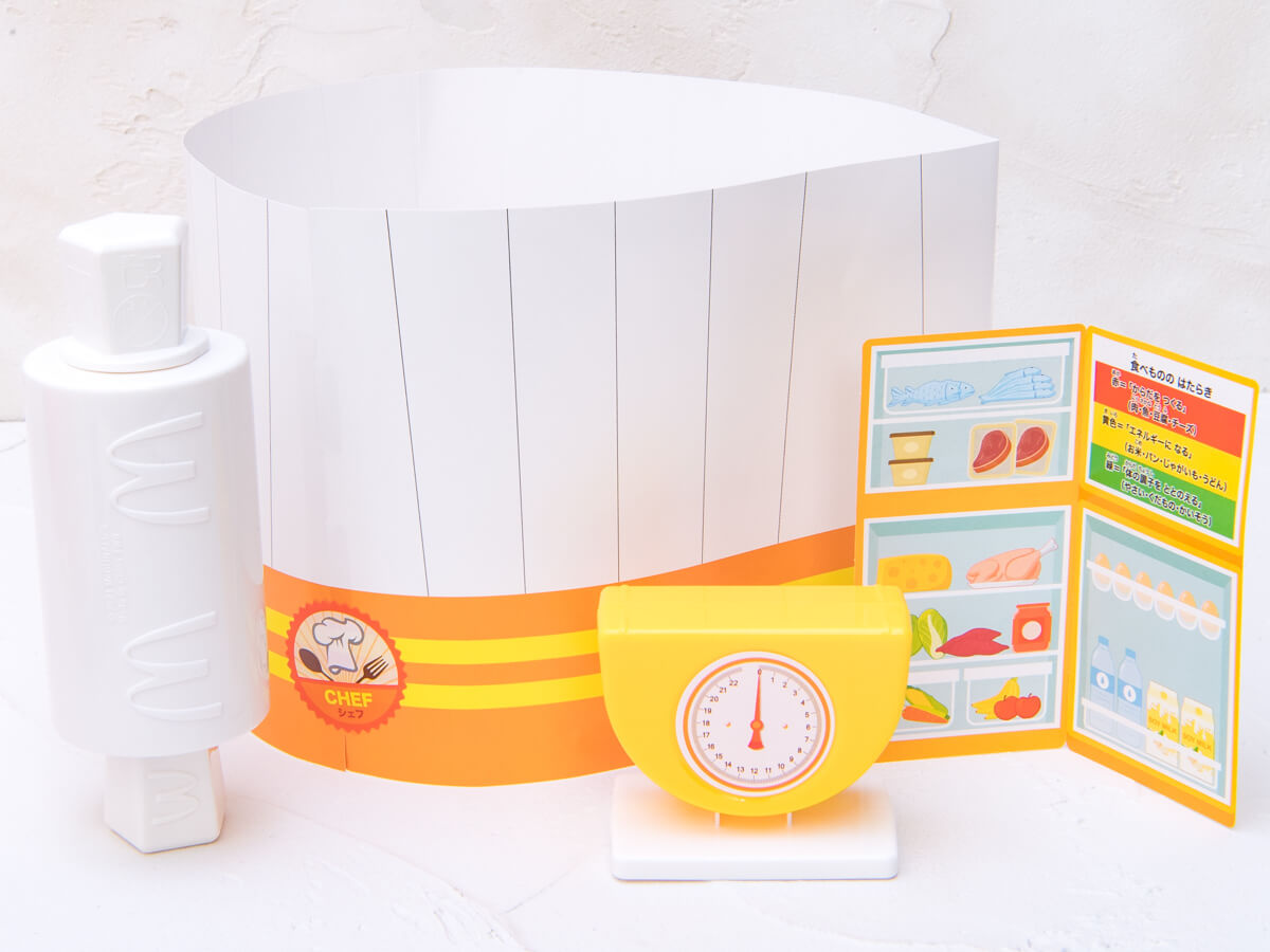 「シェフ」バージョンには、麺棒やはかり、コック帽のおもちゃと、栄養バランスについて学べる冷蔵庫型のカードをセット。
