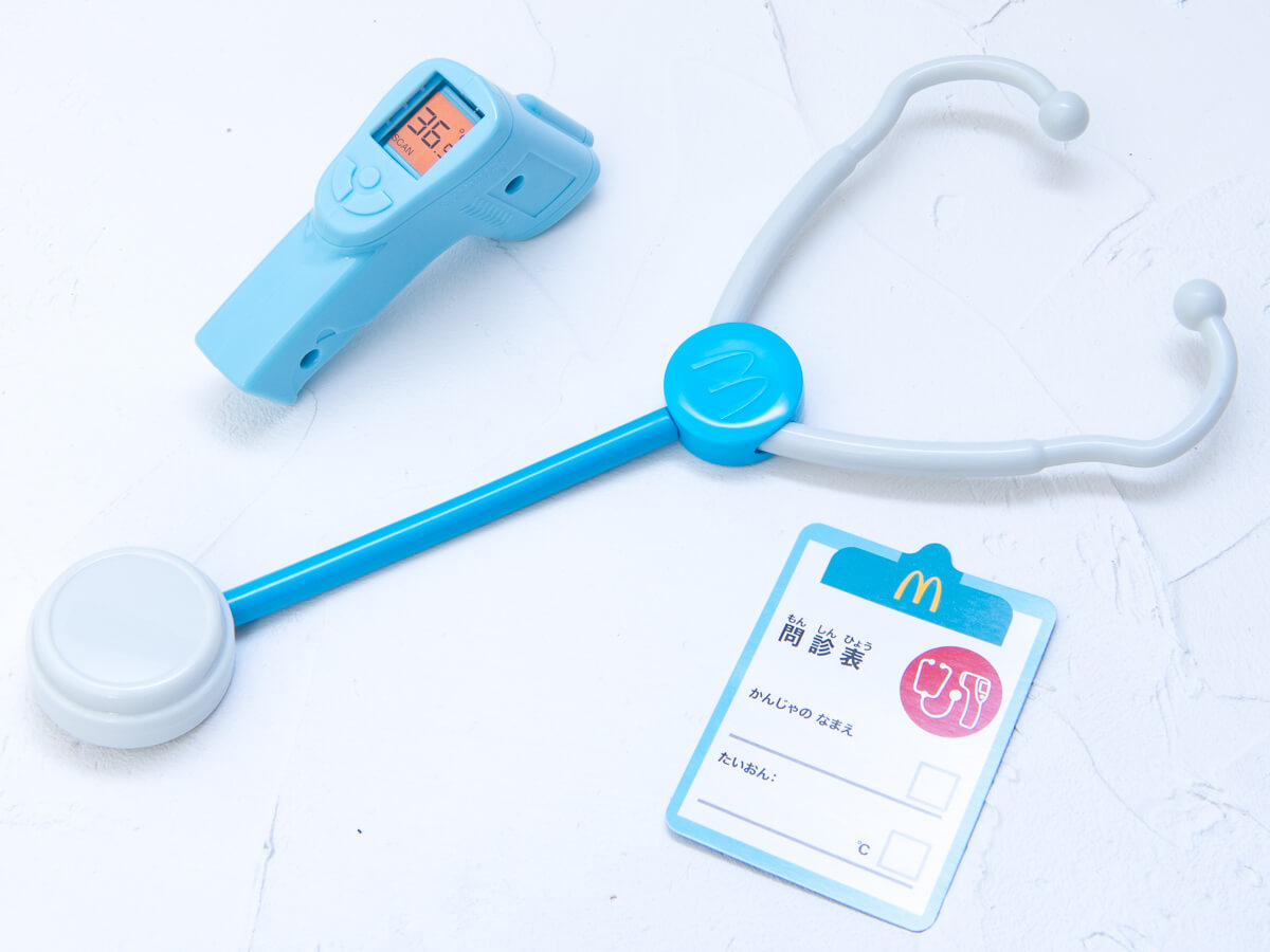 非接触型体温計や、首にかけられる聴診器のおもちゃと、お医者さんが使う用語が分かる問診票型のカードがセットになっています。