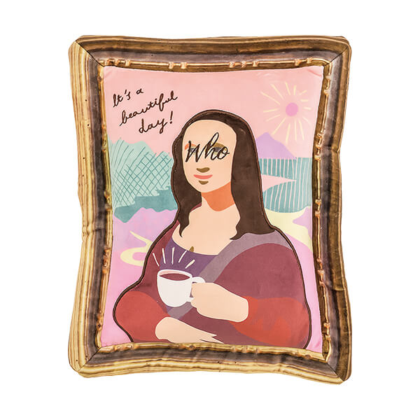 コーヒーカップを片手に持った「モナリザ」風アートが描かれています。